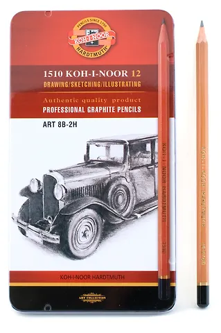 Карандаши черногрифельные 12 шт (8В - 2Н) художественные, металлическая коробка, Koh-I-Noor