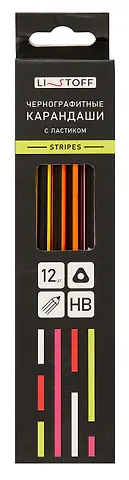 Карандаши чернографитные с ластиком 12 штук "Stripes" НВ, трехгранные, заточенные, Listoff