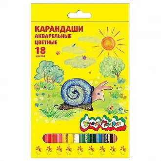 Карандаши цветные акварельные, Количество цветов: 18, Для создания акварельных картин маленькими художниками, Нарисуйте рисунок карандашом, а затем проведите по нему мокрой кистью – краски намокнут и расплывутся, превратив карандашный рисунок в акварельную картину, Изготовлены из высококачественной древесины и имеют специальный особо прочный грифель, Легко затачиваются без «заусенец», которые могут поцарапать пальчики малышей, Изготовлены из прочной и легкой древесины, Имеют идеально отцентрованный мягкий прочный грифель, Не крошатся во время заточки, не ломаются, срез остается гладким и блестящим, Хорошо заточены, Хорошо ложатся на бумагу, оставляя яркий, устойчивый к выцветанию след, Покры