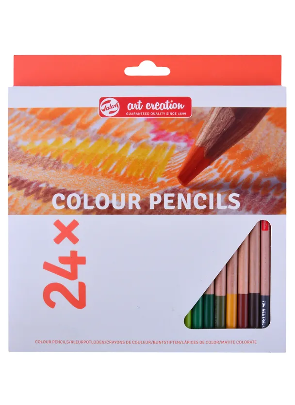 Цветными карандашами "Art Creation" работаю уже пол года нравится палитра цветов самое главное что они легко удаляются резинкой с бумаги, пигмент не жирный, палитра цветов сдержанная похожа на профессиональную. Есть оттенки охры,сиены,синие такие например как ультрамарин.Хороший набор карандашей по доступной цене.