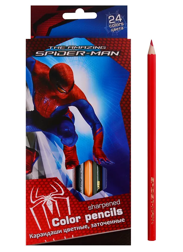 Набор цветных карандашей, 24 шт. Цветные карандаши длиной 17,8 см; заточенные; дерево - липа; цветной грифель 2,65 мм; карандаш в цвет грифеля с логотипом; логотип - тиснение "золотом"; Коробка из мелованного картона, раздвижная, европодвес, печать 4+0. Размер 9 х 21 х 2 см Spider-man