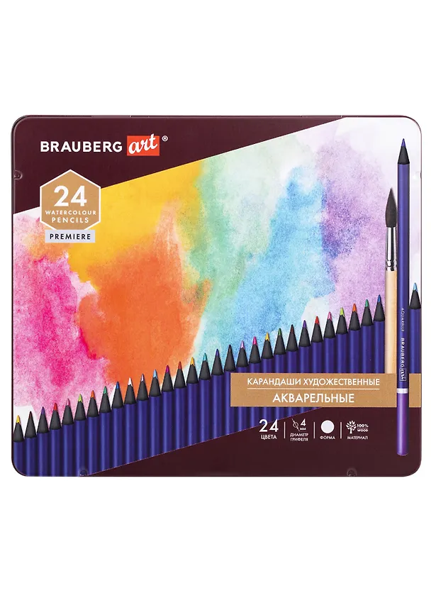 Качественные акварельные карандаши упакованные в удобную металлическую коробку, полностью набор смотрится дорого и красиво. Карандаши легко размываются водой, не теряя своего цвета, но ими можно рисовать и так, если нет под рукой кисточки. Карандаши хорошо между собой смешиваются и получаются новые чистые цвета. Точатся хорошо обычной точилкой, грифель не ломается, но есть небольшой минус в том, что они быстро расходуются (так как очень мягкие).