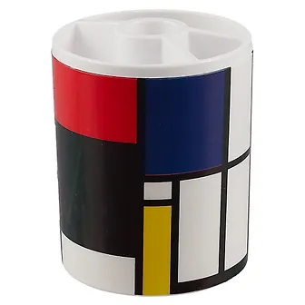 Покупала несколько таких стаканчиков, эта карандашница отличная. С точки зрения дизайна - очень удачный вариант для тех, кто не хочет каких-то отвлекающих картинок. Верхняя часть съёмная, надевается плотно, не смещается и не крутится. Нам пока она не нужна, поэтому мы ее сняли, т.к. карандашей много и нужен именно стаканчик. Сам он объемный, влезает в него много карандашей.