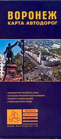 Атлас автодорог города Воронежа содержит схему расположения карт и территориальное деление города, указатель улиц, условные обозначения карт города, условные обозначения и схему расположения карт области, обзорную карту Воронежской области, адреса и телефоны подразделений ГИБДД.