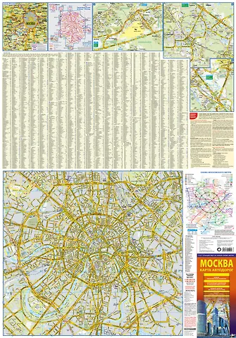 "Формат 696х996, в сложенном виде 116х250 мм.Обновленная карта выполнена в масштабе 1:45 000 ( 1 см на карте - 440 м на местности)..Центральная часть (в пределах Третьего Транспортного кольца) представлена в масштабе 1:24 000 ( 1см – 240 м) с полной организацией движения..Карта предназначена для пространственной ориентировки в пределах МКАД, наиболее удобна при планировании поездок между частями города:.• четко выделены главные городские магистрали и их инфраструктура..• даны схемы движения транспорта, развязки и наиболее сложные пересечения магистралей..• показаны и подписаны все улицы, состоящие на официальном учете..• представлена новая схема метро со станциями пересадок на МЦК. .Фальцовк
