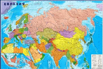 Настенная политическая карта Евразии, без рамы размером 1570x1070 мм. Масштаб 1:9 000 000. Карта отпечатана на мелованном картоне, без ламинации. Цветом выделены все страны, подписаны их названия и столицы, основные населенные пункты. Цветным фоном показан рельеф суши и морского дна. Даны основные автомобильные и железные дороги, порты, аэропорты. Год издания - 2023.