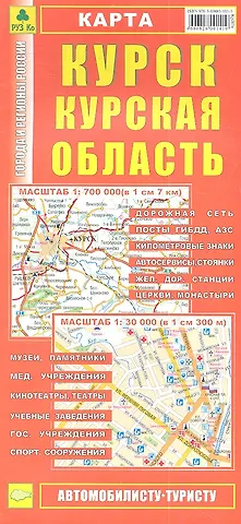 Двусторонняя полноцветная карта. Содержит подробный план города со всеми улицами, номерами угловых домов. Указано расположение административных зданий и социально-культурных объектов. Имеется указатель улиц. Масштаб г. Курска 1:30 000. Подробная карта области с указанием класса дорог и расстояний между населенными пунктами в километрах. Указано расположение постов ГИБДД, автозаправочных станций, гостиниц и домов отдыха. Имеется указатель населенных пунктов. Масштаб 1:700 000. Формат 495х695мм.