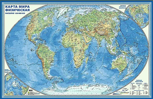 Карта мира физическая(большая). Настенная карта с ламинацией. 1:20 000 000, формат 150х97 см