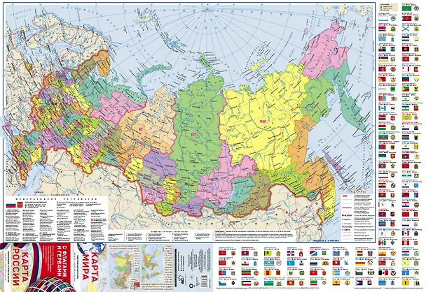 Складная карта содержит политическую карту мира и политико-административную карту России, карта дополнена флагами, гербами и справочной информацией с указанием площади территорий, численности населения, столиц и центров государств мира и субъектов РФ.