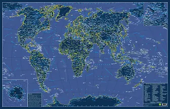 .Светятся: контуры материков, островов и государств, пунсоны столиц государств.