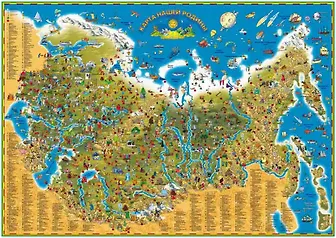 Карта России – важное наглядное пособие в процессе обучения ребенка. Эта карта поможет не только в изучении географии нашей родины. Яркие четкие изображения представителей различных национальностей и народностей нашей страны, животных, растений, архитектурные памятники, символы полезных ископаемых, расположенные по географическому признаку помогут освоить ребенку информацию о многообразном мире Родины, понять и оценить ее природные богатства, многонациональность и масштаб. Это важно для общего культурного развития дошкольников и детей младшего школьного возраста.