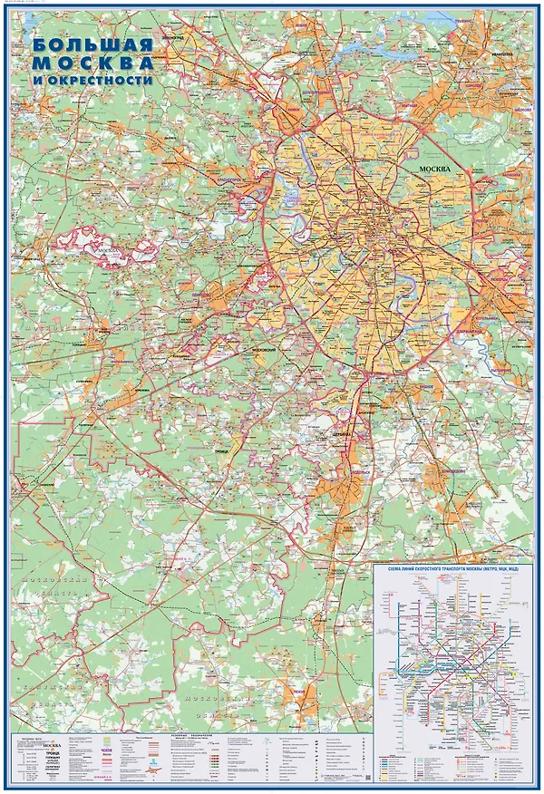 Настенная карта "Большая Москва и окрестности" размер 1,07*1,57 м, качественная полиграфия, актуальная информация. Показана Москва, включая присоединенные территории, а также прилегающие районы Московской области.
