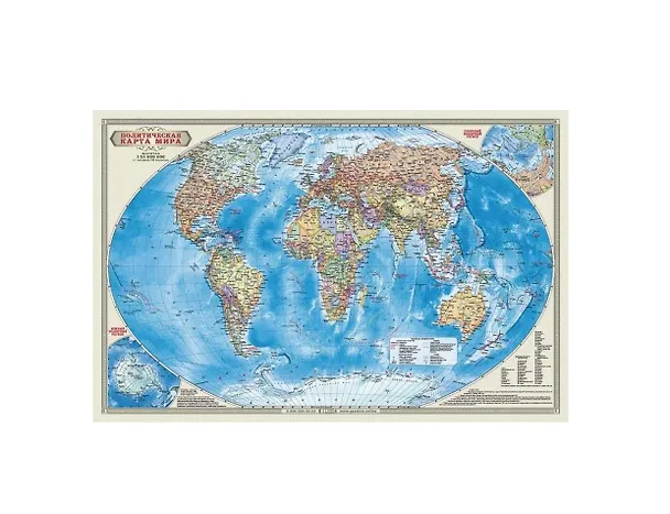 Карта политического мира подробно отражает современное политико-административное устройство мира и границы государств. Территории государств выделены цветом. Населённые пункты отображены по числу жителей и административному значению, показаны основные наземные пути сообщения и судоходные каналы. Особенность данной карты в том, что на ней, помимо геополитической информации, размещена символика государств мира. Государственные флаги стран мира сгруппированы по каждому континенту.