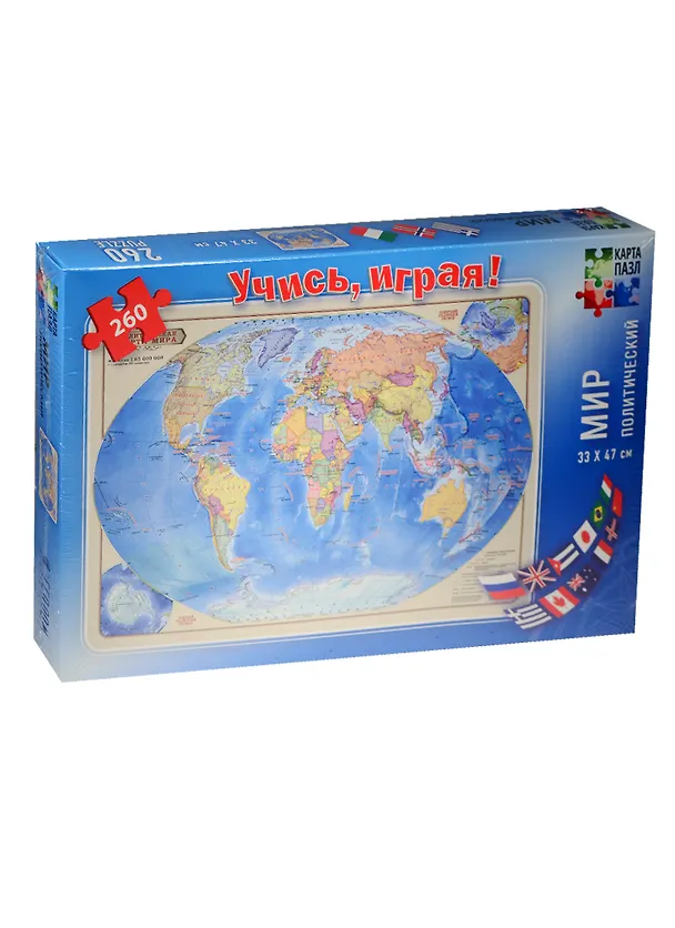Ваш ребенок в процессе игры с большим интересом изучит политико-административное устройство мира и познакомится со столицами государств. Пазлы с картой мира позволяют узнать, какие океаны омывают материки и острова. Это отличный метод познакомиться с особенностями географии уже с малого возраста. Играя, ребенок развивает воображение, пространственное мышление, внимание, память и способность анализировать! Познавайте окружающий мир вместе с ребенком, собирая карты-пазл!
