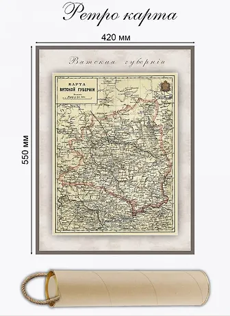 Карта-ретро Вятской губернии, состояние на 1892г., в картонном тубусе с подвесом
