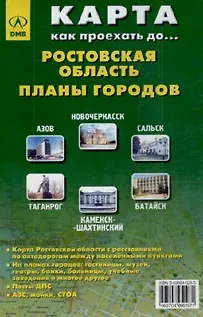 Вашему вниманию предлагается карта Ростовской области (масштаб 1:750 000) и планы городов: Азов (масштаб 1:25 000), Новочеркасск (масштаб 1:25 000), Сальск (масштаб 1:25 000), Таганрог (масштаб 1:25 000), Каменск-Шахтинский (масштаб 1:20 000), Батайск (масштаб 1:30 000) в одном издании. Также в этом издании: