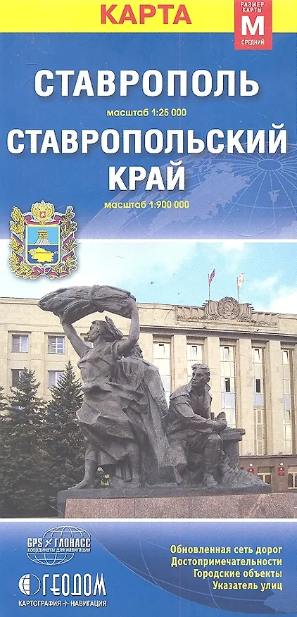 Карта. Ставрополь (1:25 000). Ставропольский край (1:900 000). Обновленная сеть дорог, достопримечательности, городские объекты, указатель улиц