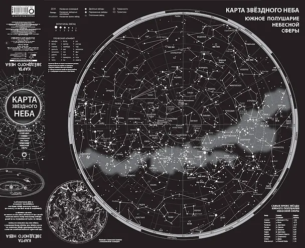 Звёзды на карте ранжированы по видимой звёздной величине. Даны названия самых ярких звёзд и условные очертания всех 88 созвездий. Приведёны краткие сведения о Солнечной системе, небесной сфере, звёздных координатах, эклиптике и зодиакальном круге. Размеры карты в сложенном виде 112,86х213,33 мм. Карта будет полезна для всех, кто интересуется астрономией.