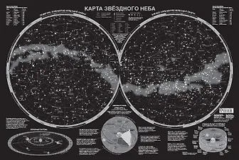 На этой необычной настенной карте размером 870х580 мм представлены северное и южноео полушария небесной сферы. Так ночное небо с мерцающими на нём галактиками, туманностями и звёздными скоплениями выглядит с Северного и Южного полюсов Земли.
