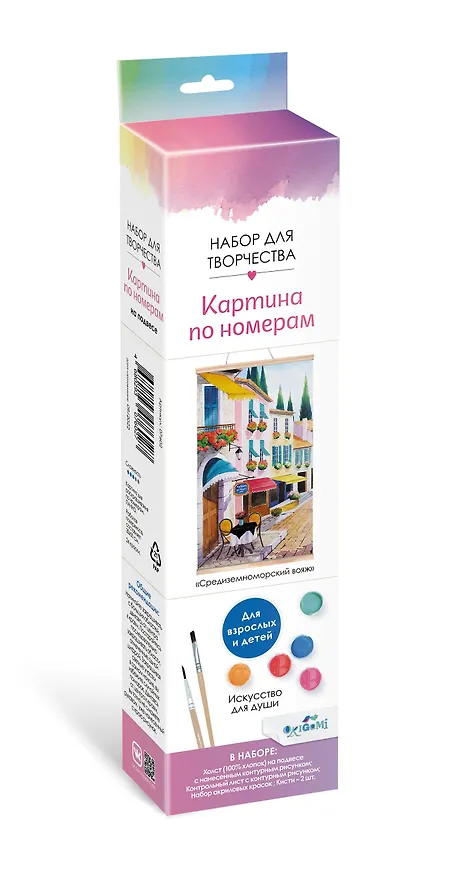 В наборе: основа с нанесенным контурным рисунком, 2 кисточки, акриловые краски, контрольный лист.