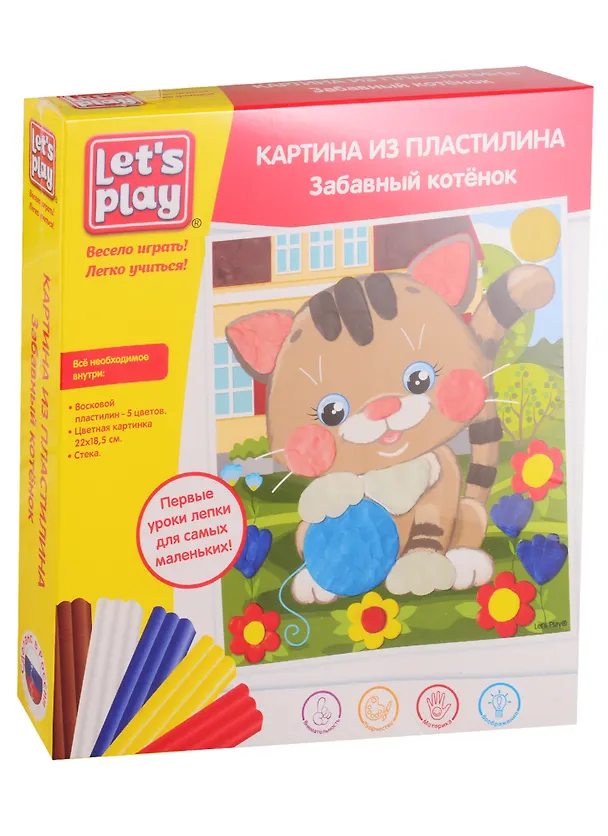 В наборе ТМ Let’s play 7 предметов: цветная картонная картинка (22 х 18,5 см), 5 брусков воскового пластилина, пластиковая стека. Мягкий восковой пластилин легко разминается и моделируется, не липнет к рукам. Срок годности не ограничен. Товар сертифицирован. Упаковка: коробка.