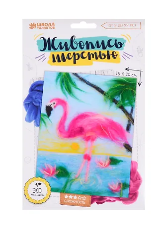 В комплекте вы найдёте лоскуты цветной шерсти, специальную иглу и лист фетра, который будет служить холстом для вашей картины. Дополнительно вам понадобятся ножницы, губка или кусок поролона и немного воды для смачивания пальцев во время работы.
