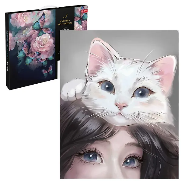 Набор для творчества Картина по номерам арт. 67953 Кошачьи нежности, размер: 40х50 см, (23 цвета (-ов), холст на деревянном подрамнике с напечатанной схемой рисунка, контрольный лист с нанесенной схемой, краски акриловые на водной основе, кисти художественные с ворсом из нейлона – 4 шт., подвесы для подрамника, пакет на zip-молнии, лак в комплекте, картонная коробка с ручкой)