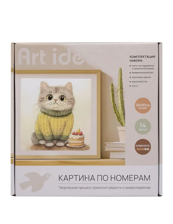 Картина по номерам Котенок с пирожным Размер: 20х20см, количество красок: 14, уровень сложности: 3, на раскрашивание потребуется: примерно 6-7 часов, натяжка холста: Стандартная. Вы хотите ощутить себя настоящим художником? Раскраски по номерам интересны как для детей, так и взрослых. Ведь многие любят рисовать, но порой не хватает способностей или навыков. Раскраски по номерам от «Art idea» различной сложности дают возможность создать шедевр собственными руками, независимо от подготовки. Все очень просто: На подрамник натянут холст, который разделен на цветовые сегменты будущей картины. Печать контуров на холсте осуществляется устойчивыми к воде экосольвентными чернилами на профессиональном