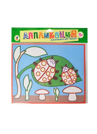 Аппликация из песка - мелкий цветной песок, нанесённый на клеевую основу рисунка, позволяет создать оригинальную картинку. В набор входят: цветная основа с контуром рисунка и клеевым слоем, 6 пакетиков цветного песка, картинка-образец, декоративные глазки.