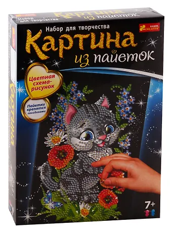 Набор содержит: цветные пайетки, гвоздики, цветная схема, пенопластовая основа, инструкция.