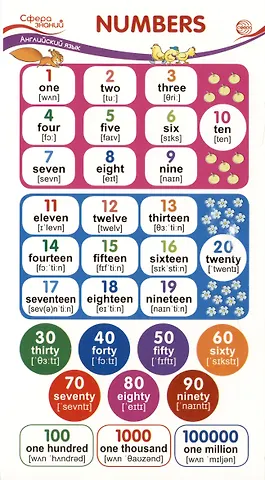 Для меня данная карточка является отличной находкой для изучения и повторения числительных на английском языке. Данная тема для детей одна из сложных, а с помощью данной карточки можно с интересом изучать числительные. Все числительные поделены на не большие блоки (от числа до 10, затем от 11 до 20, после представлены десятки, в самом низу карточки сотня, тысяча и т.д.). Каждое числительное сопровождается английской транскрипцией.