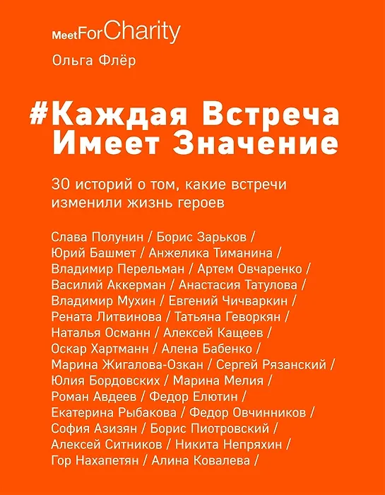 В книгу Ольги Флер вошли рассказы разных людей — бизнесменов, артистов, актеров театра и кино, рестораторов, деятелей науки, журналистов, писателей и многих других. Это книга про благородные дела и хорошие поступки. Ведь идея издания связана с другим проектом автора — Meet For Charity (MFC), который помогает многим благотворительным фондам и объединяет неравнодушных людей. Именно так участники Meet For Charity стали героями книги