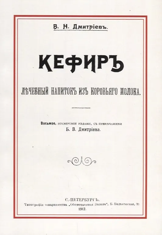 Репринт с 8-го издания. С примеч. Б. В. Дмитриева, посмертное издание. Санкт-Петербург, тип. т-ва "Обществ. польза", 1912. Технология изготовления, лечебное значение, способы приготовления и употребления кефира, литература о кефире. Книга изготовлена по технологии "печать по требованию". Тираж 30 экз.
