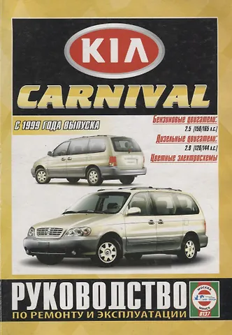 Kia Carnival. Руководство по ремонту и эксплуатации. Бензиновые двигатели: К5 2,5 л/110 кВт (150 л.с.), К5 2,5 л/121 кВт (165 л.с.). Дизельные двигатели: KJ 2,9 л/93 кВт (126 л.с.), KJ 2,9 л/106 кВт (144 л.с.)