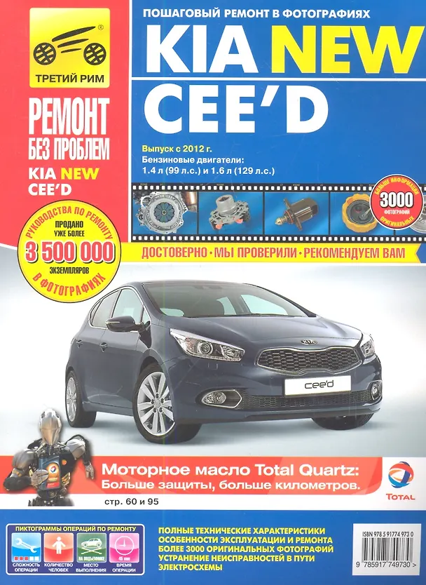 Ремонт без проблем Руководство по ремонту и эксплуатации автомобиля Kia cee’d New с бензиновыми двигателями объемом 1.4 и 1.6 л. выпуска с 2012 г. В первом разделе руководства приведены общие сведения об автомобиле, паспортные данные, описаны приборы и органы управления автомобилем. Во втором, третьем и четвертом разделах даны рекомендации по эксплуатации, правила техники безопасности при эксплуатации автомобиля и проведении ремонтных работ, неисправности в пути, техническое обслуживание автомобиля.