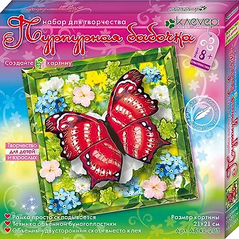 Аппликация-картинка «Пурпурная бабочка» станет превосходным подарком для юного художника и позволит собственными руками создать маленькое чудо природы, которое восхитит не только сверстников, но и старших. Комплект включает все необходимое: цветную бумагу, цветной картон, проволоку, бисер, атласную ленту, тонкий и объемный двухсторонний скотч, а также подробную пошаговую инструкцию. Использование двустороннего скотча вместо клея делает работу более аккуратной, удобной и безопасной для ребенка. Для оформления готовой работы в комплекте предлагается живописная дизайнерская рамка. А полученная изысканная объемная аппликация может послужить украшением интерьера или оригинальным подарком для друз