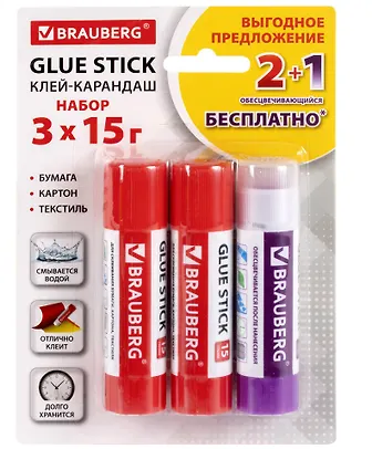 Клей-карандаш 3шт 15г "2+1 обесцвечивающийся" блистер, BRAUBERG