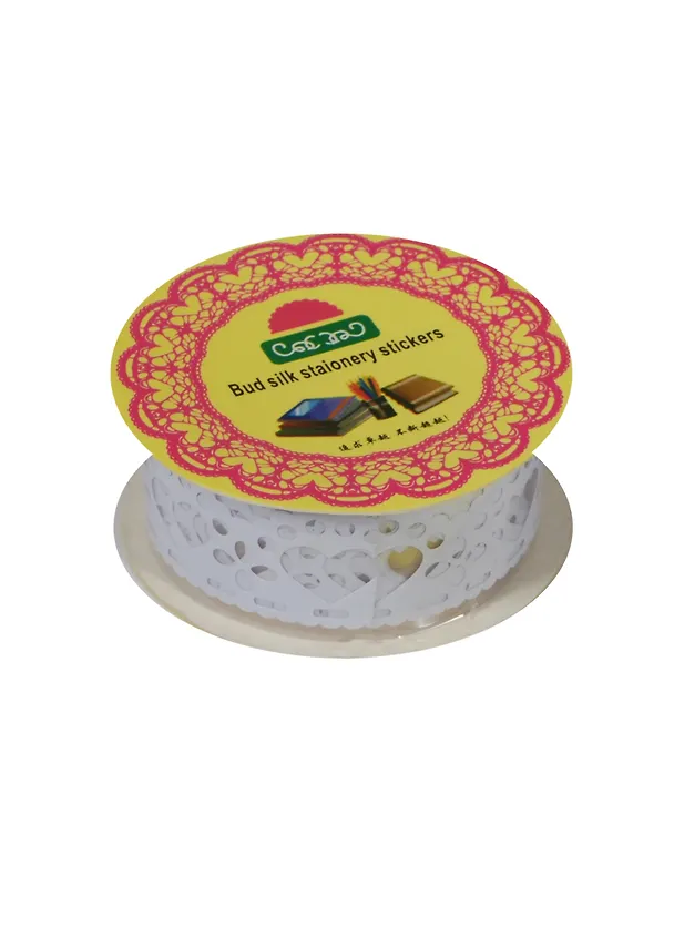 Похоже на обычный прозрачный скотч, только с белым ажурным узором. На узоре повторяющиеся стилизованные сердечки. Узор мне напомнил белые вязаные бабушкины салфетки. Длина рулона не указана, но, судя по всему, она небольшая - картонная катушка с лентой на ощупь совсем тонкая.