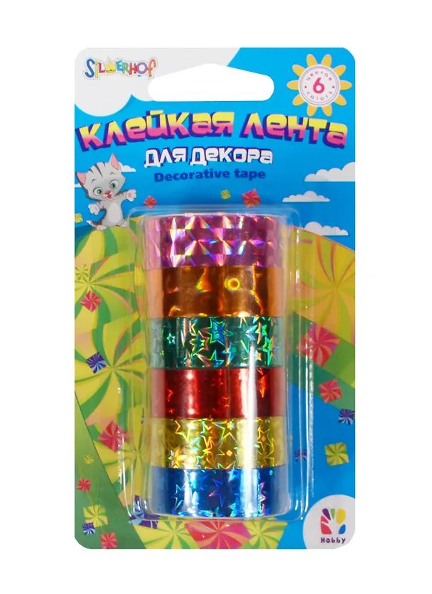Клейкая лента д/декора Hobby Блеск (481026) (470-0263) (12ммх3м) (6 дизайн.) (роз/оранж/зелен/красн/желт/син) (на РР-основе) (3+) (блистер)
