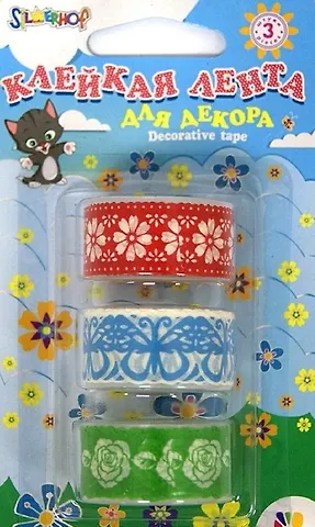 Клейкая лента д/декора Hobby бумажная 3шт 18мм*1,5м (ромашки/бабочки/розы) в блистере 481014