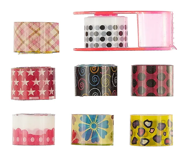 Скотч декоративный 12мм*2 метра, 8 роликов + держатель для скотча в блистере с европодвесом,ассорти дизайн