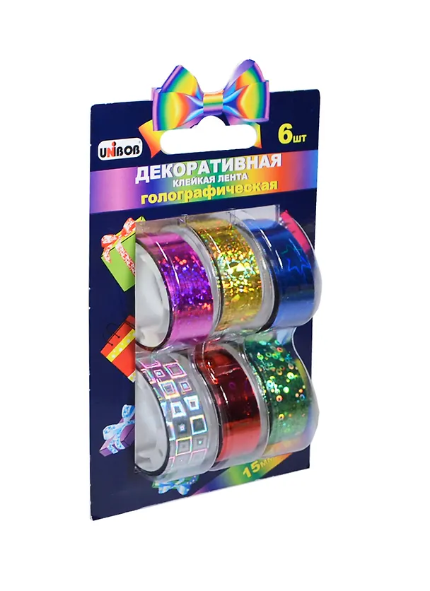 Клейкие ленты 15мм*5м декоративные голографические UNIBOB 6шт.,ассорти,европодв,ш/к39502