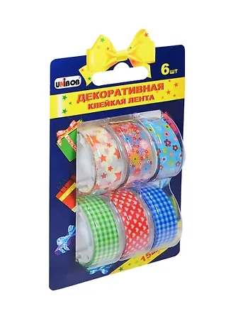 Клейкие ленты 15мм*5м декоративные UNIBOB 6шт., ассорти, европодвес, ш/к39489