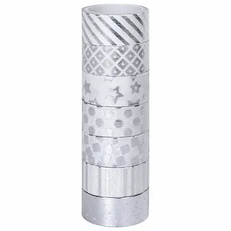 Клейкие WASHI-ленты для декора с фольгой СЕРЕБРИСТЫЕ, 15 мм х 3 м, 7 шт., рисовая бумага, ОСТРОВ СОКРОВИЩ, 661713