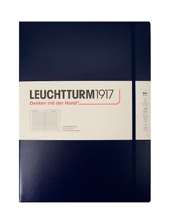 Записная книжка Leuchtturm Master Slim A4+ в линейку, темно-синего цвета, в твердой обложке чуть больше стандартного формата А4. Размер (22,5х32,5см) делает этот лехтурм по-настоящему вместительным, а небольшой объем оставляет возможность носить его с собой, не прибавляя ощутимого веса сумке.