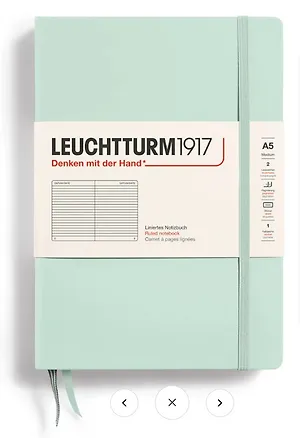 Линейчатый блокнот Leuchtturm формата A5 в твердом переплете мятно-зеленого цвета сочетает в себе прочность с лаконичным и современным дизайном. Он идеально подходит для организации заметок или планирования дня.