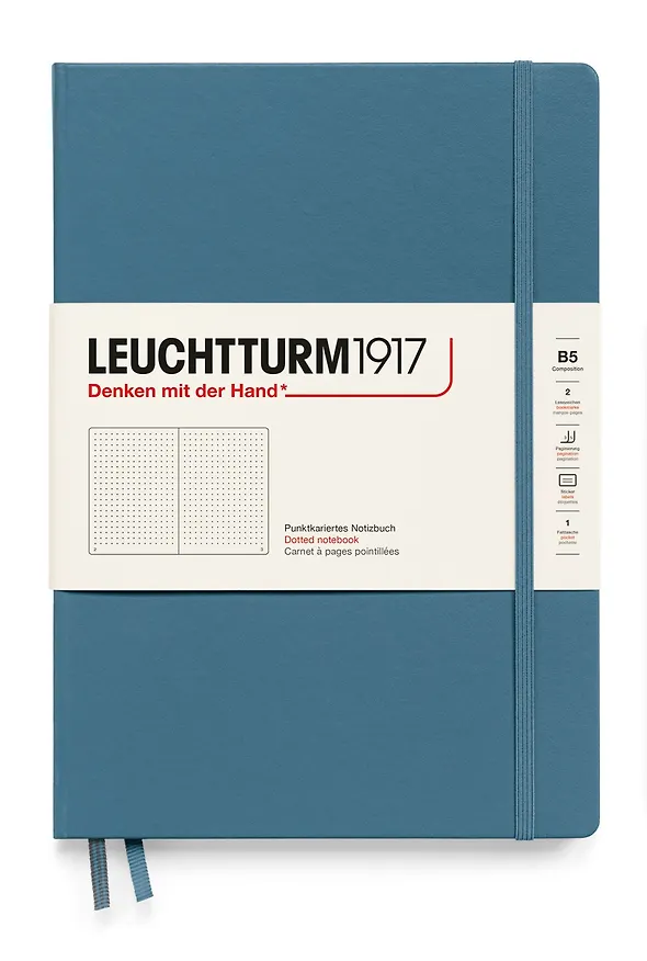 Блокноты для дома, офиса и путешествий. Популярный формат B5 походит для любого образа жизни, он немного больше формата A5, но меньше формата A4, что создает идеальное пространство для записей, заметок и даже зарисовок везде, где это необходимо. Блокнот содержит 109 пронумерованных листов. Твердый переплет позволяет писать заметки прямо на весу, а так же надежно сохранит содержимое блокнота и опрятный внешний вид. Блокноты серии Composition обладают всеми атрибутами Leuchtturm1917 — резинка-фиксатор, закладка ляссе и удобный кармашек на задней части обложки.