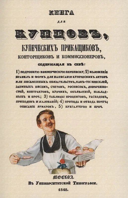 Содержание: Ч. 1. Коммерческая переписка, правила и формы письменных обязательств. Ч. 2. Таблицы процентов, расхода, прихода и жалований; прихода и отхода почт; описание ярмарок; бухгалтерия и проч.