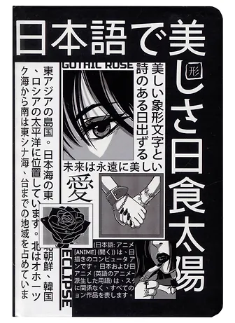 Довольно неплохой блокнот. Подойдёт для любителей аниме и альтернативной культуры. Выполнен в монохромных тонах с надписями на японском. Надеюсь, там написаны хорошие вещи.