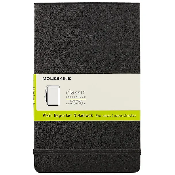 Нелинованный блокнот Reporter (Репортер) от Moleskine размера large отличается откидной обложкой и 24 отделяемыми листами для быстрых заметок в задней части. Его можно располагать как горизонтально, так и вертикально. Этот продукт выполнен в шитом переплете с картонной обложкой со скругленными углами, эластичной застежкой и вместительным внутренним карманом, куда вложена открытка с историей Moleskine.